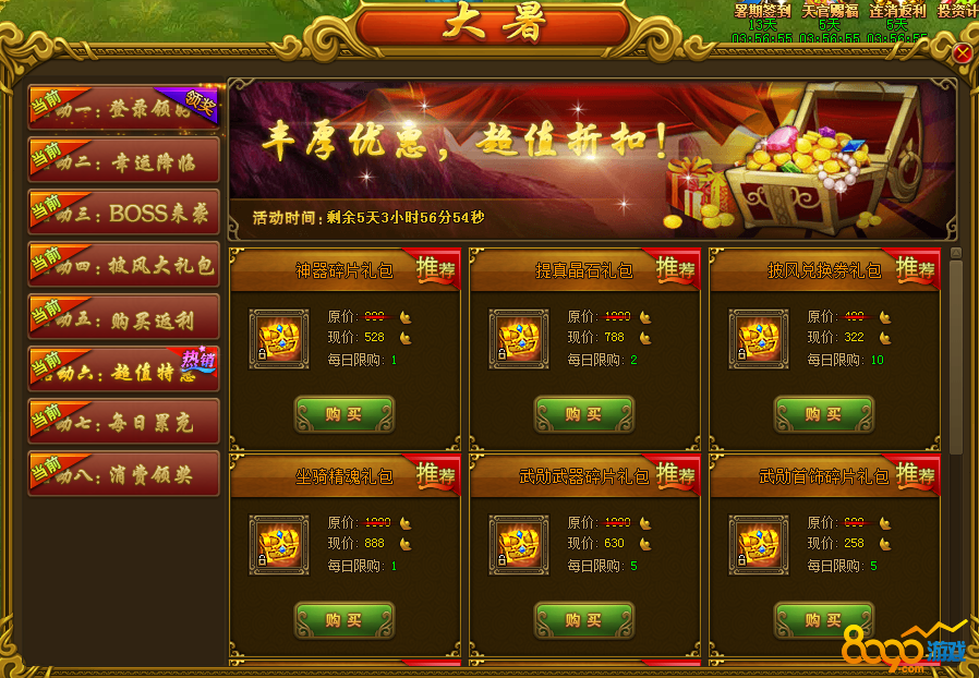 8. 每日累计充值50000元宝可获得:(7阶内甲碎片*2、7级武攻、7级追伤、7级武防、7级防御)5选1、高级战力礼包、(提真晶石,宝甲精魂,坐骑精魂)三选一*10、神佑卷轴*20、玄火珍选礼盒*10。