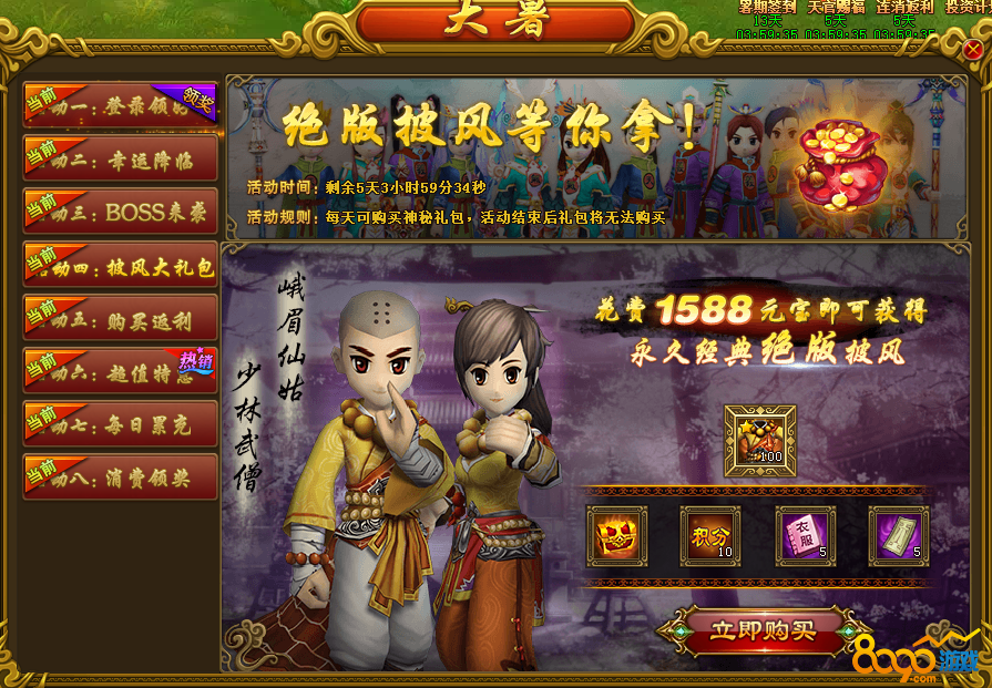 活动规则:活动期间内,花费元宝可购买绝版披风礼包。
