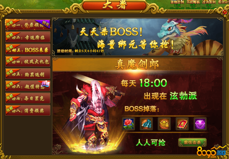 活动规则:活动期间,每天18:00都会在泫勃派出现boss,击杀可掉落相应奖励。