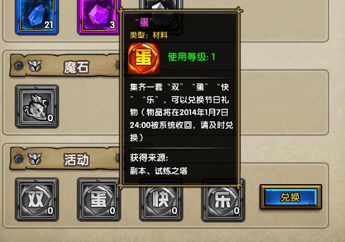 【温馨提示】:双蛋活动结束后,系统需清除玩家物品栏中的所有活动物品,同时兑换按钮变灰不可点。