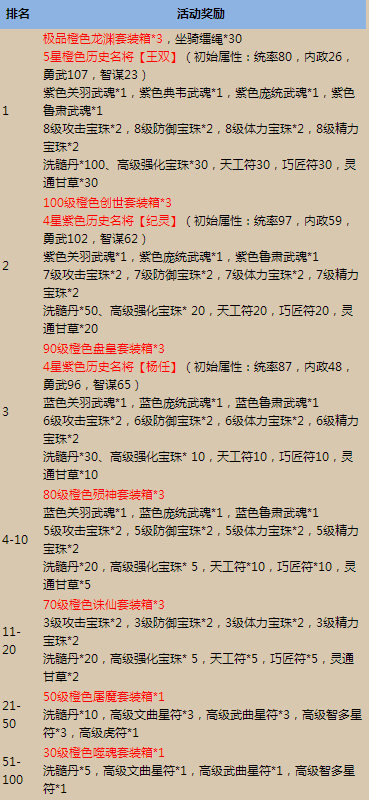 活动期间,每天0点截止时,将领榜战斗力排名第一名的玩家,可获得1个五星极品名将的橙色武魂!