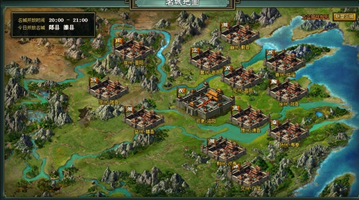 玩家可以通过点击主界面上的“名城战”图标,也可以通过联盟面板的“联盟名城”的“名城地图”按钮两种方式打开“名城地图”。每天晚上20:00到21:00完成史诗“群雄争霸”后,每周一到周五,开放2个州城。完成史诗“三国鼎立”后,每周日,开放都城洛阳。君主等级达到50级,联盟等级达到5级的玩家可派遣1支军团加入名城战。 拥有名城的联盟,及其友好联盟,是防守方。其余联盟是进攻方。攻破官府的联盟,可拥有该名城,成员在联盟仓库竞拍州城官印拥有名城可获得资源加成、名城特权、招募特殊兵。