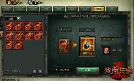 热血三国2中的极品装备当然是龙渊系列。低阶的龙渊装备通过打造还可成为玄武、朱雀、白虎、青龙装备,四大神兽齐聚,必将搅动三国风云。龙渊装备也可以打造麒麟装备啦,进入装备强化,点击打造,任意选择一件青龙装备,搜集附加材料,就可以打造出最强的麒麟装备。而准备一件橙色的麒麟装备作为主装备,辅以同部位的开天装备,消耗5张天工符,就可以进阶为红色品质的麒麟装备,不但可以获得开天装备主属性的50%,炼化属性的70%,还可获得强力属性加成。