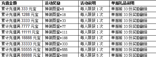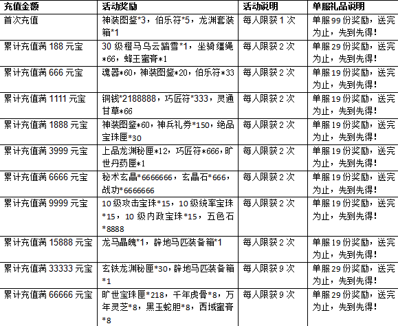1. 活动期间充值,玩家充值一定数额的元宝,即可获得系统赠送的奖励。