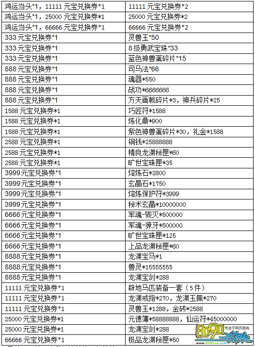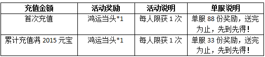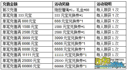 (注:单笔充值指本次活动期间,一次性充值的元宝数目来获得相应的奖励。例如:玩家一次性充值了3999元宝,则可以获得前面6档的单笔充值奖励,之后再充值3000元宝,也不能获得6666这一档的单笔充值奖励。)