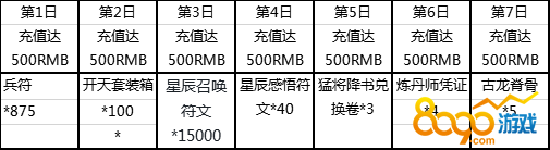 比如玩家第1天充值500,第2天充值500,第3天没有充值, 第4天充值500,则计算活动期间累计充值3天,可获得奖励兵符*875,开天套装箱*100,星辰召唤符文*15000
