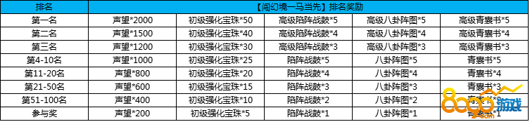 幻境攻城参与即有奖,前100名奖励翻倍。