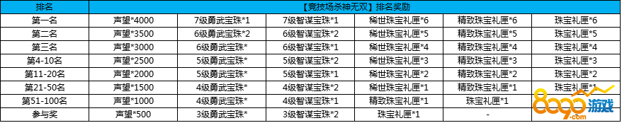 活动规则:活动截止时,根据竞技场排名,获得相应奖励。排名100名之后的,竞技场累计胜利10次,也可以获得参与奖!