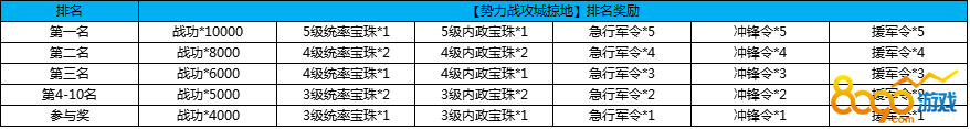 活动规则:活动截止时,根据势力拥有的城池数排名,势力每个成员均可获得相应奖励。排名10名之后的,势力曾经拥有城池数达到50个,也可以获得参与奖!