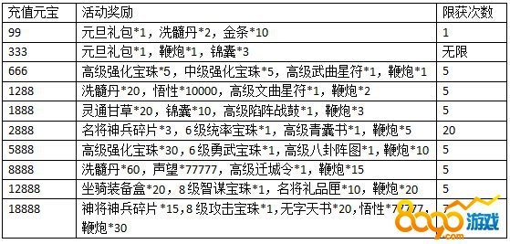 活动说明:活动期间玩家充值每达到一定额度可以得到活动奖励。