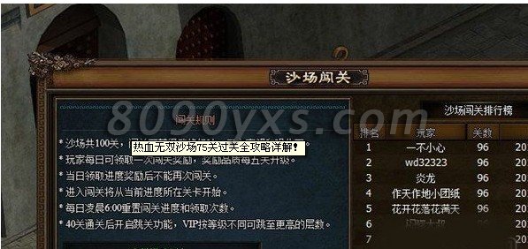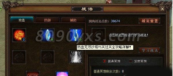 搜索"8090网页游戏"热血无双沙场75关过关全攻略详解!热血无双;热血无双沙场;热血无双攻略!热血无双沙场75关的主将是祝融夫人,这个将如果不先灭掉的话就会无限招兵,不针对这个将打的话等她招兵过4次的话基本过关无望了《除非你的战力已经到了无视她的地步》。