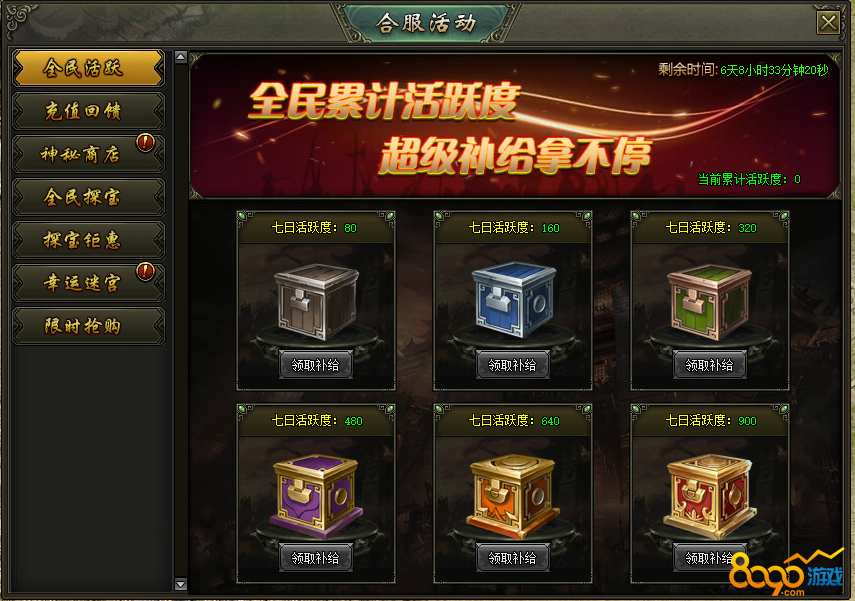 活动说明:活动期间内,累计活跃度达到指定需求,即可领取对应活跃度宝箱