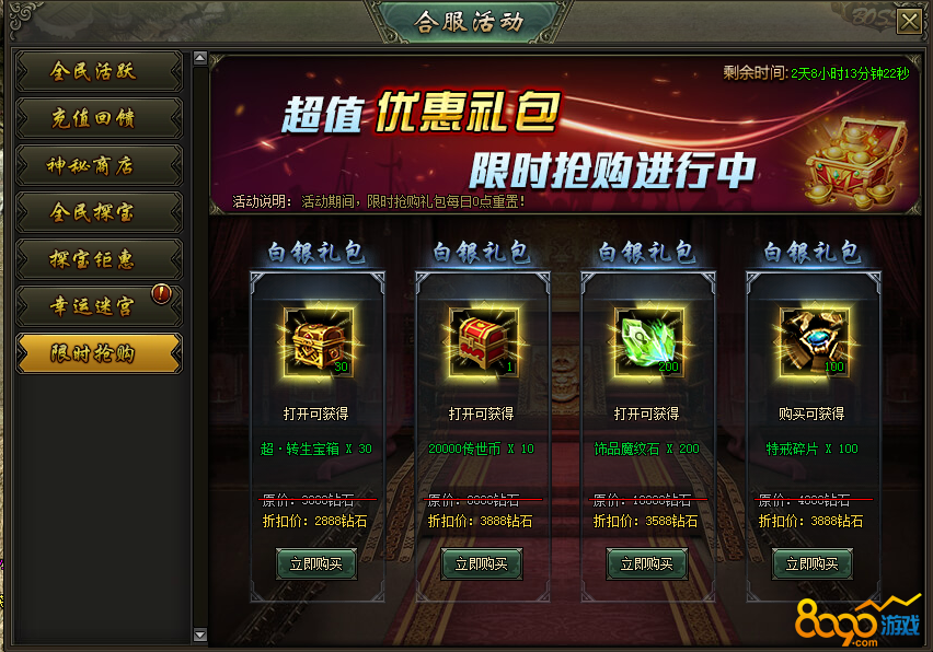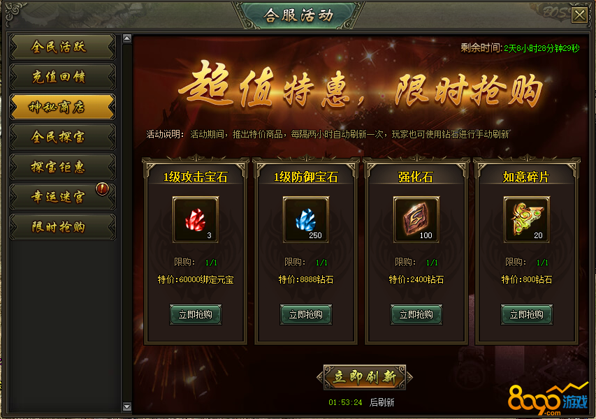 活动说明:活动期间,推出特价商品,每隔两小时自动刷新一次,玩家可使用钻石进行手动刷新