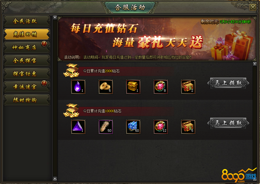 活动说明:活动期间,每日充值达到指定额度,即可领取超值豪礼,每种档位可领取一次