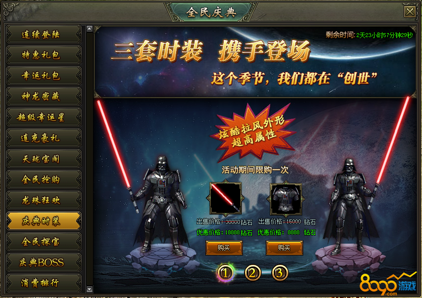 活动说明:活动期间,绝版时装限时出售,炫酷拉风外型、超高属性都在这里!