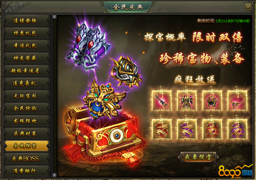 活动说明:活动期间,龙之宝藏产出圣装的概率限时翻倍,极品圣装、珍稀宝物大放送!