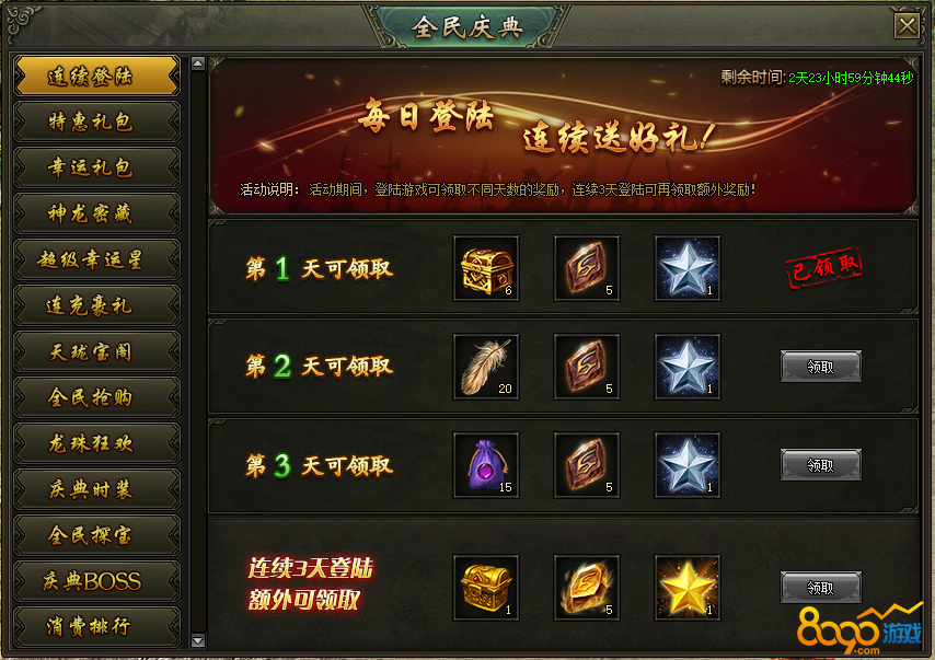 活动说明:活动期间,登陆游戏可领取不同天数的奖励,连续3天登陆可再领取额外奖励