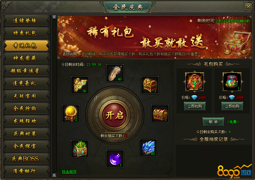 活动说明:活动期间,购买礼包获得抽奖次数,购买礼包次数和抽奖次数每日0点重置。