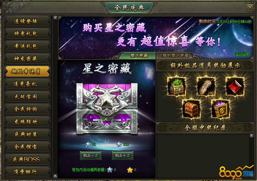 活动说明:活动期间,玩家使用幸运星开启星之密藏可获得各种奖励,更有较大几率获得2倍奖励及更高价值的额外奖励。