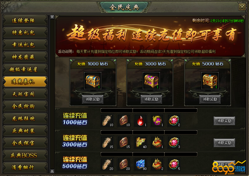 活动说明:每天累计充值到指定档位即可领取奖励,活动期间连续3天充值到指定档位可领取超级福利