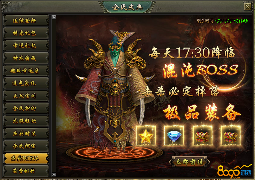 活动说明:活动期间,每天17:30混沌魔殿入口限时开启,全服玩家合力击败2大混沌BOSS,有机会获得海量元宝、钻石、稀有材料及高级装备奖励