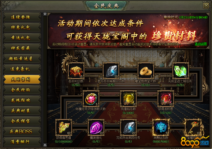 活动说明:活动期间,完成天珑宝阁内的对应任务条件可领取大量奖励。天珑宝阁每天24点重置