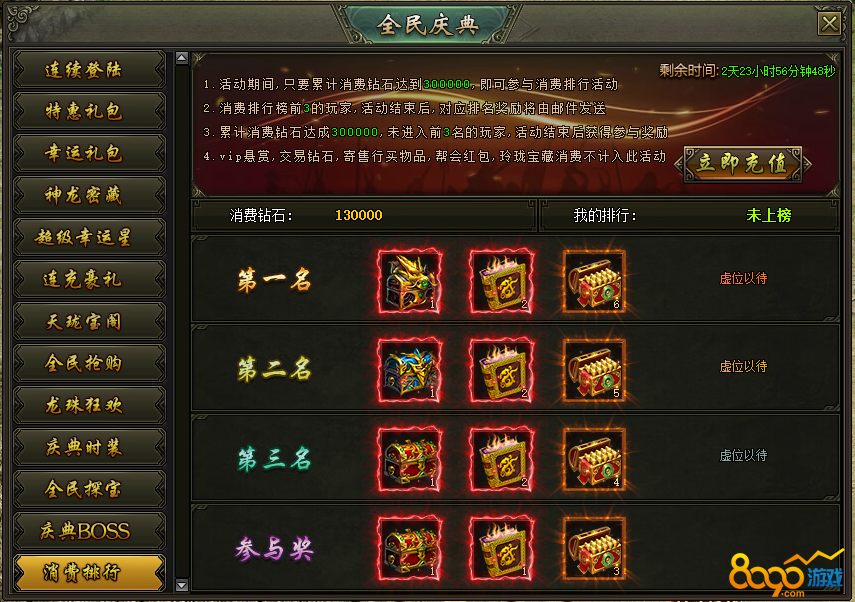 活动说明:活动期间,消费达到300000钻石的玩家参与排行,排名前三的玩家可获得珍贵装备、稀有道具等奖励,奖励在活动结束后以邮件的方式进行发放