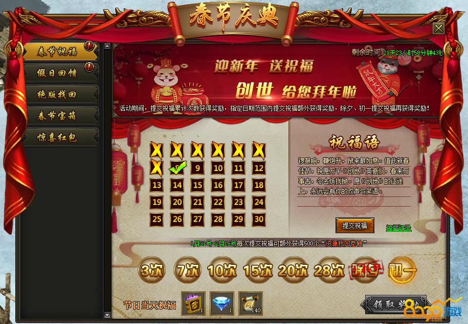 活动说明:活动期间,每天可提交一次春节祝福语,提价祝福达到一定次数可领取大量奖励,除夕、初一当天提交祝福可领取超值奖励