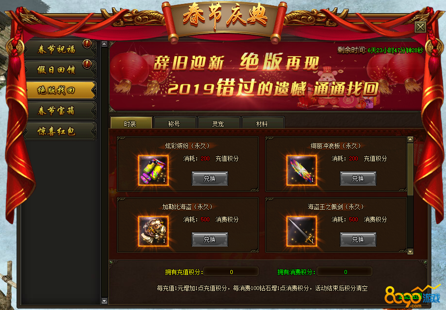 活动说明:活动期间,玩家每充值1元增加1点充值积分;每消费100钻石获得1点消费积分。消耗充值积分或消费积分可兑换绝版道具