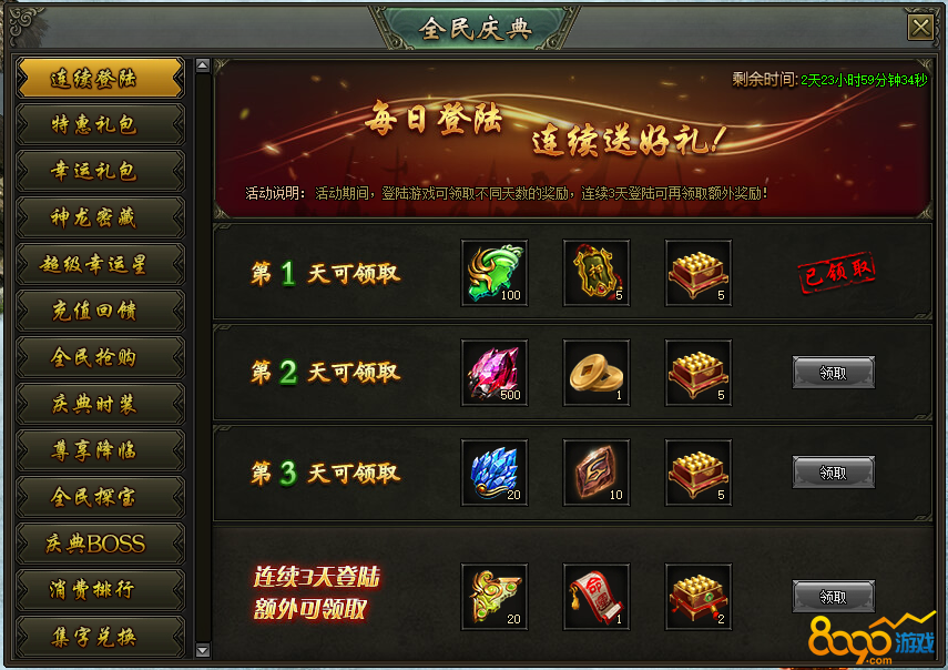 活动说明:活动期间,登陆游戏可领取不同天数的奖励,连续3天登陆可再领取额外奖励