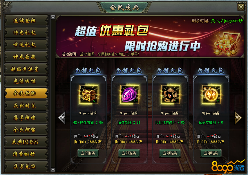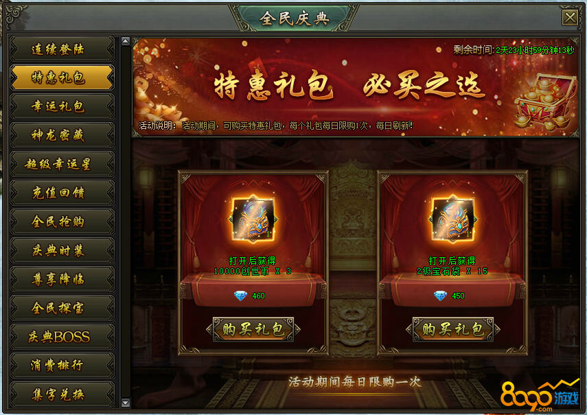 活动说明:活动期间,可购买特惠礼包,每个礼包每日限购1次,每日刷新!