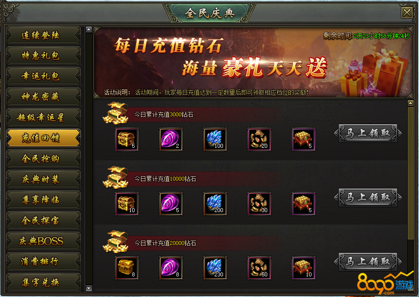 活动说明:活动期间,玩家每日充值达到一定数量后即可领取相应档位奖励!