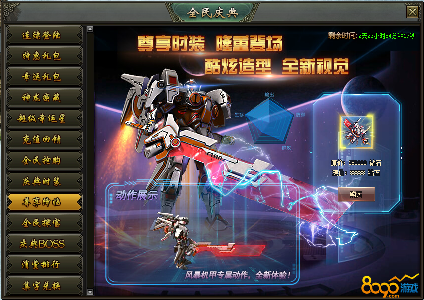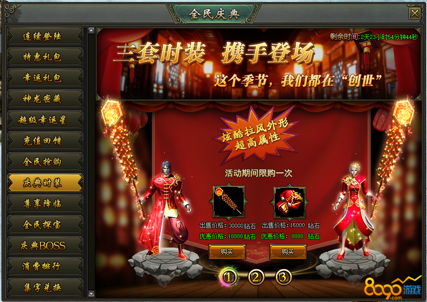活动说明:活动期间,绝版时装限时出售,炫酷拉风外型、超高属性都在这里!