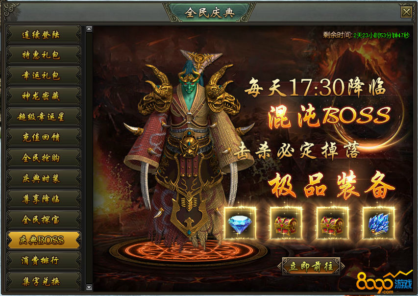 活动说明:活动期间,每天17:30降临混沌BOSS,击杀必定掉落极品装备