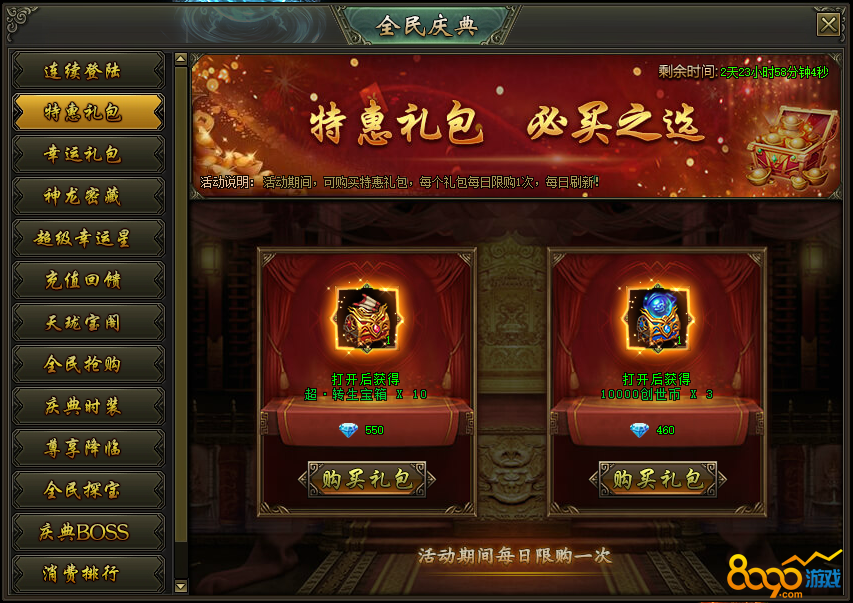 活动说明:活动期间,可购买特惠礼包,每个礼包每日限购1次,每日刷新!