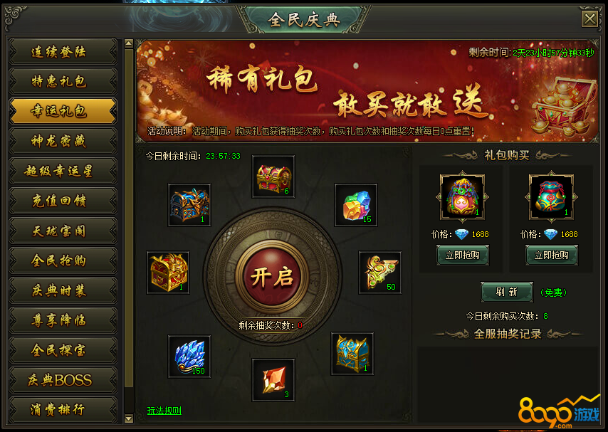 活动说明:活动期间,购买礼包获得抽奖次数,购买礼包次数和抽奖次数每日0点重置。