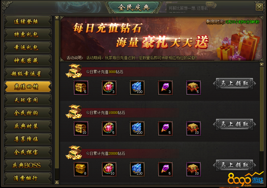 活动说明:活动期间,玩家每日充值达到一定数量后即可领取相应档位奖励!