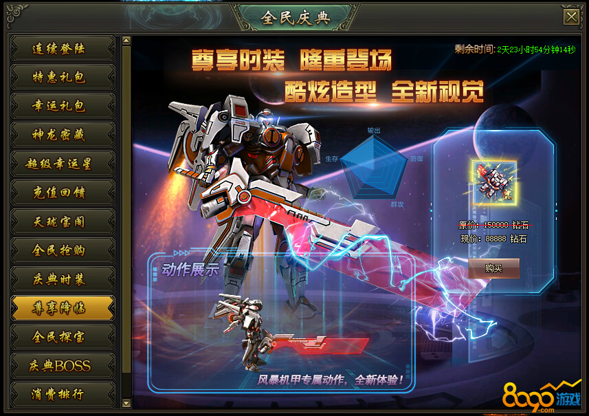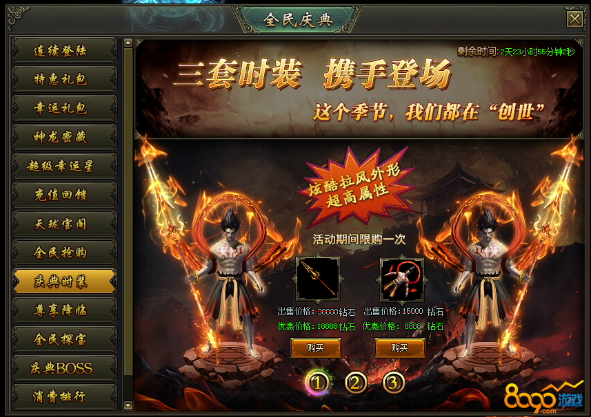 活动说明:活动期间,绝版时装限时出售,炫酷拉风外型、超高属性都在这里!