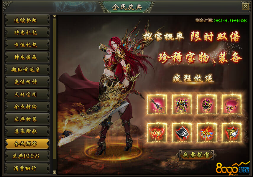 活动说明:活动期间,龙之宝藏产出圣装的概率限时翻倍,极品圣装、珍稀宝物大放送!