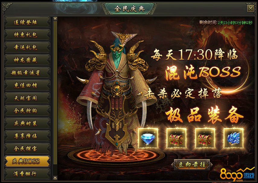 活动说明:活动期间,每天17:30降临混沌BOSS,击杀必定掉落极品装备