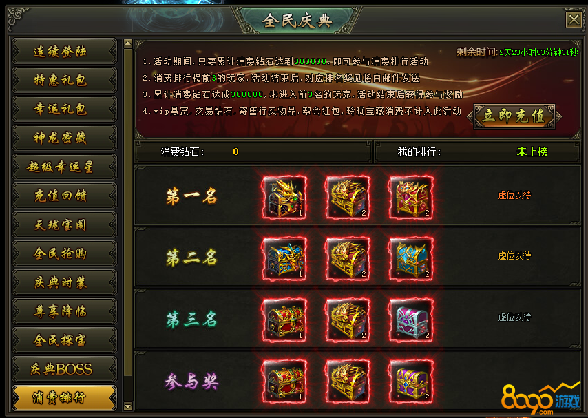 活动说明:活动期间,消费达到300000钻石的玩家参与排行,排名前三的玩家可获得珍贵装备、稀有道具等奖励,奖励在活动结束后以邮件的方式进行发放