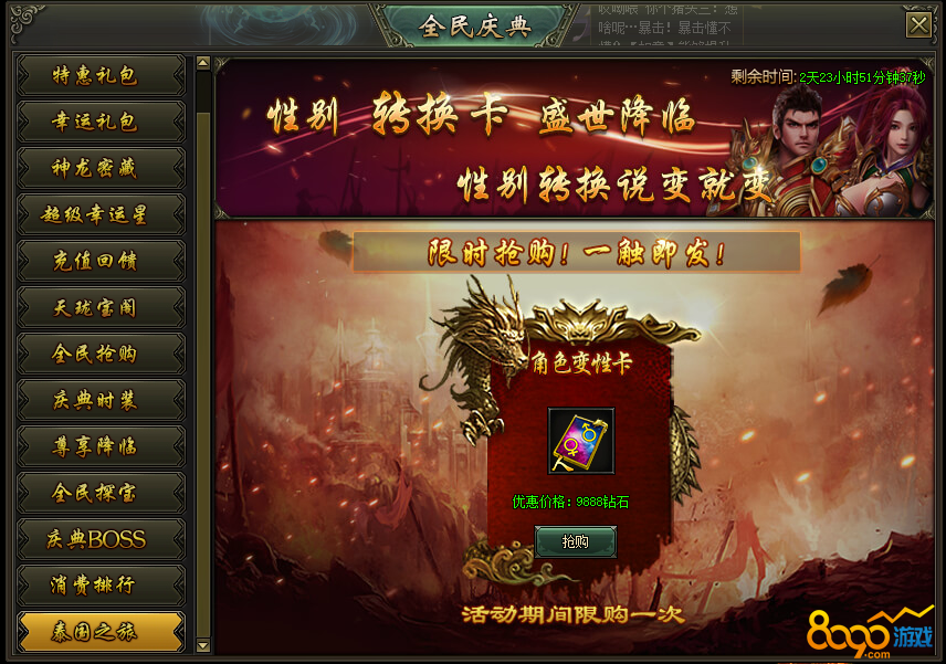 活动说明:活动期间,可购买角色变性卡,性别转换,说变就变