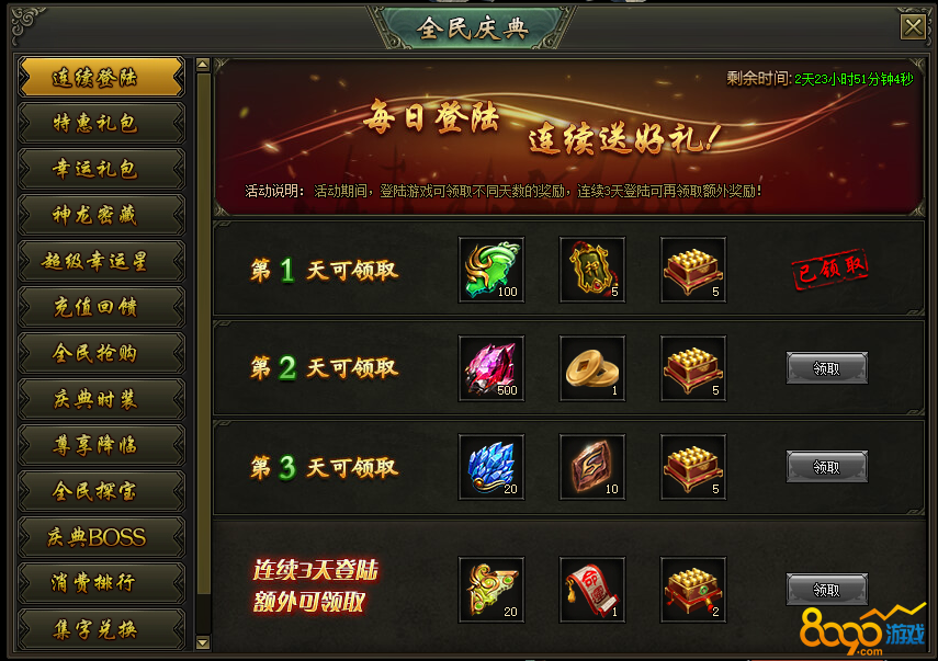 活动说明:活动期间,登陆游戏可领取不同天数的奖励,连续3天登陆可再领取额外奖励
