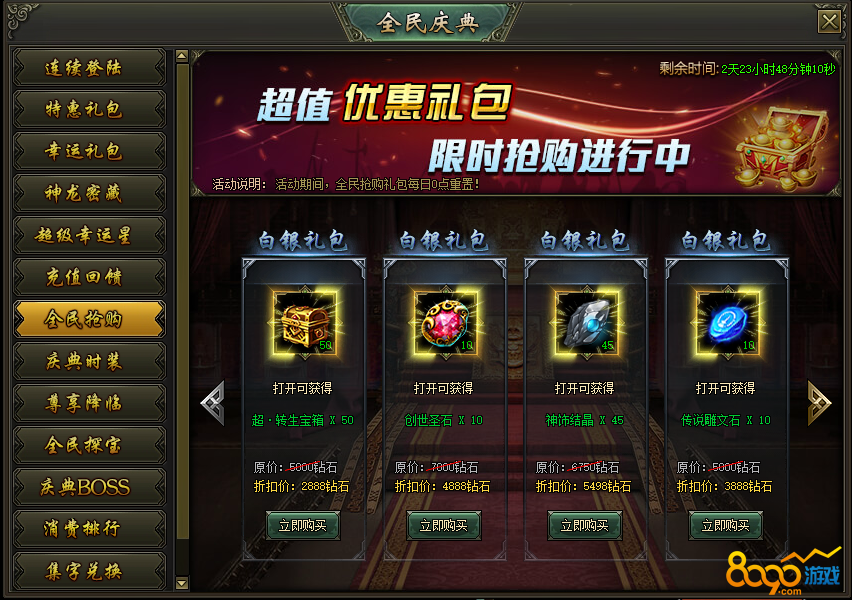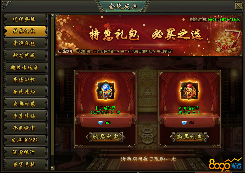 活动说明:活动期间,可购买特惠礼包,每个礼包每日限购1次,每日刷新!