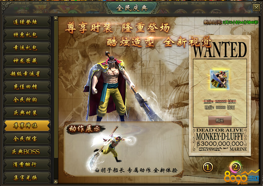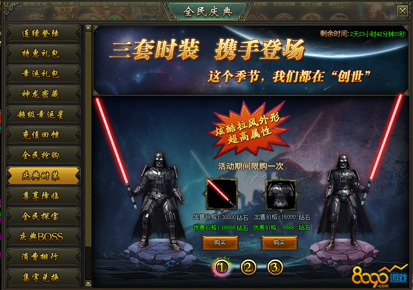 活动说明:活动期间,绝版时装限时出售,炫酷拉风外型、超高属性都在这里!
