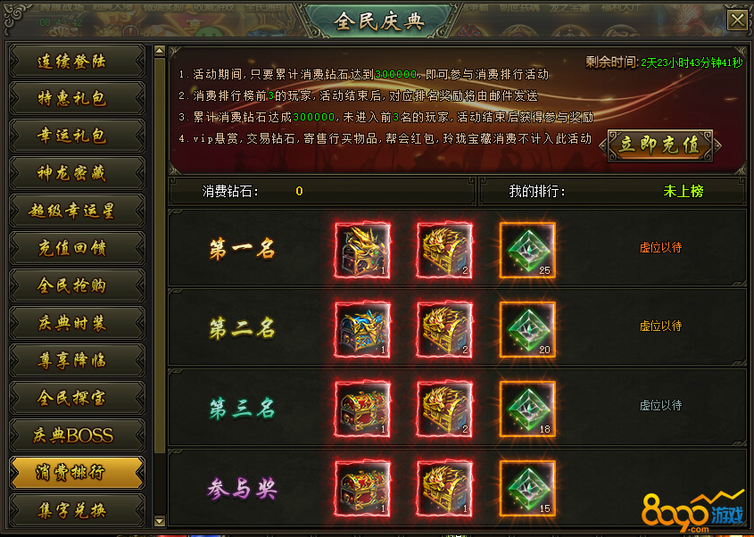 活动说明:活动期间,消费达到300000钻石的玩家参与排行,排名前三的玩家可获得珍贵装备、稀有道具等奖励,奖励在活动结束后以邮件的方式进行发放