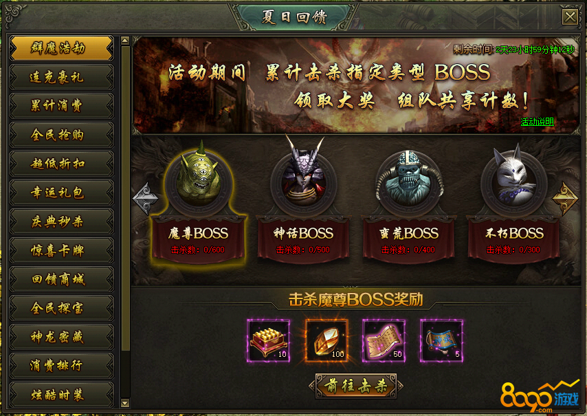 活动说明:活动期间,累计击杀指定类型BOSS,可领取超值奖励
