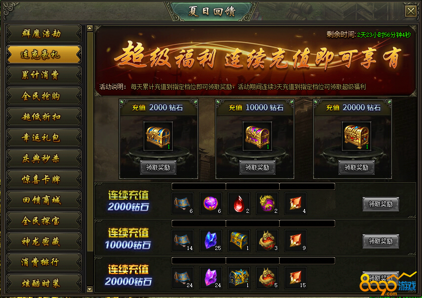 活动说明:活动期间,每天累计充值到指定档位即可领取对应奖励,连续充值3天可领取连充大奖