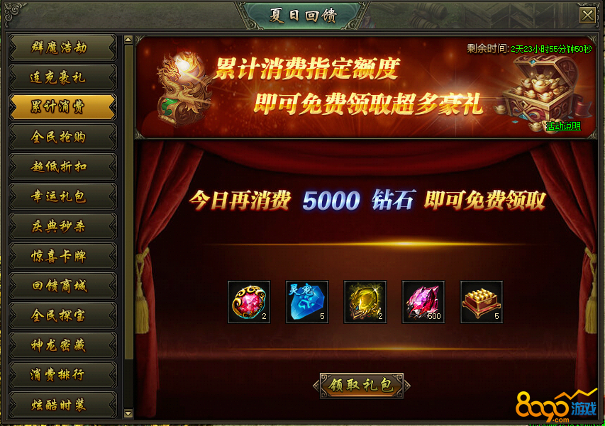 活动说明:活动期间,每日累计消费钻石数达到指定额度可领取超多豪礼