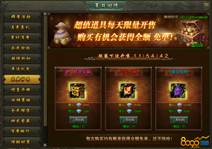 活动说明:活动期间,超值道具每天限量开售,购买更有机会获得全额免单